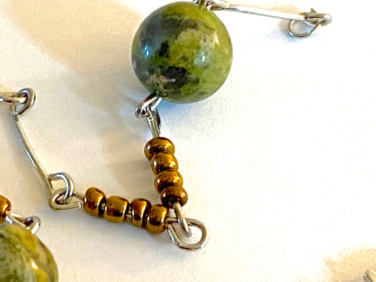 This collection of earrings include studs, dangling teardrops and hoops, and other dangling earrings. Earrings are made by hand using gemstones such as green aventurine, amazonite, blue sodalite, tiger eye, amethyst, and garnet. Glass beads in a variety of colors add detail to each design.