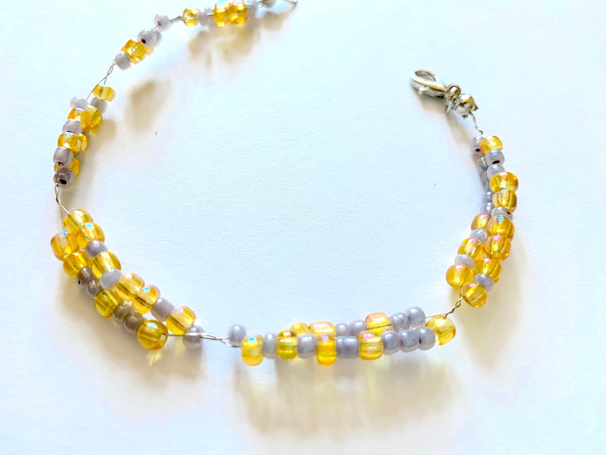 Dress up your daily or evening attire with this fashionable bracelet in yellow and gray glass beads. The metal wire was twisted to form delicate loops holding translucent glass beads.